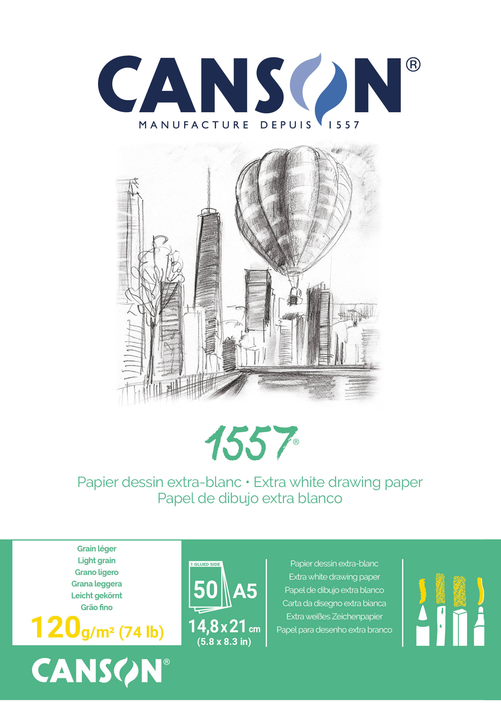 Canson 1557 A5 skisseblokk med 50 limte ark 120 g/m² gir deg praktisk papir i kompakt format for skisser, tegninger og kreative illustrasjoner. Den lett kornete, lyse hvite overflaten fremhever kontraster og gir en naturlig følelse under blyant, fargeblyant, kull, pastell og tusj. Papiret holder godt på pigmentene og gir presis kontroll for detaljer og skyggelegging.
