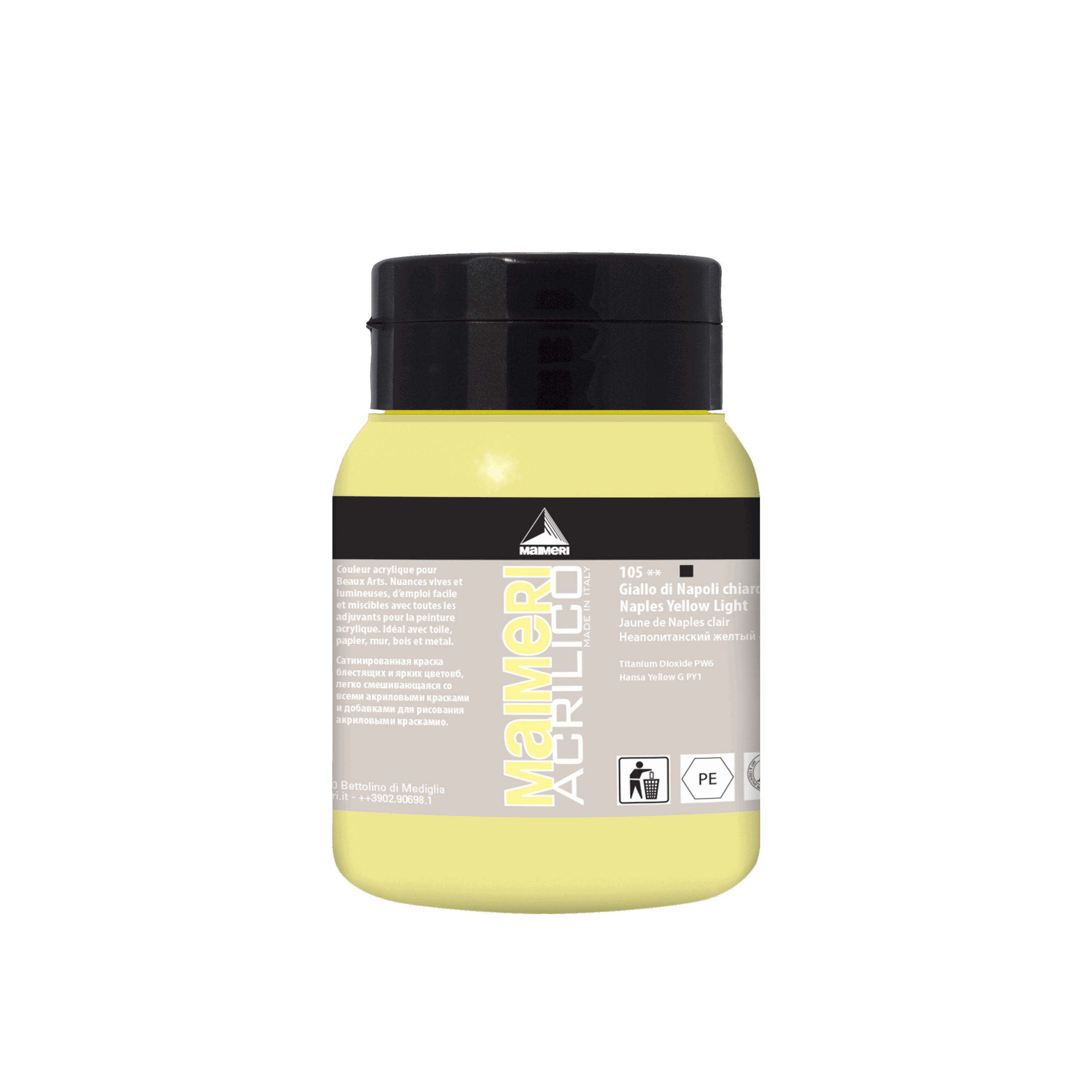 Maimeri Acrilico Naples Yellow Light 500 ml er en høykvalitets akrylmaling, utviklet for kunststudenter, profesjonelle kunstnere og seriøse amatører. Fargen Naples Yellow Light er ugjennomsiktig og gir lyse, varme gultoner med medium lysbestandighet, perfekt for detaljer, større flater og lagdeling i malerier.