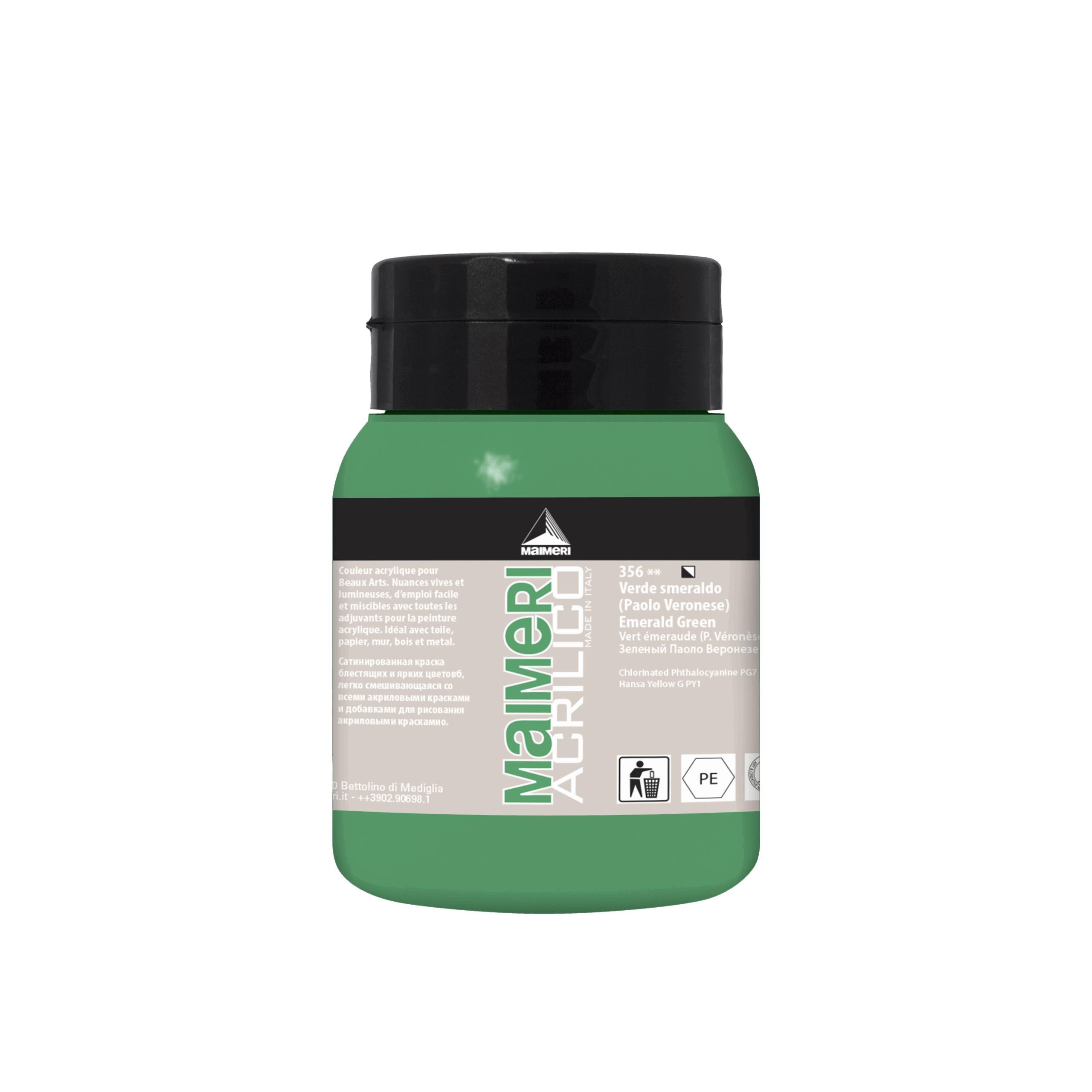 Maimeri Acrilico Emerald Green 500 ml er et solid valg for kunstnere som ønsker en klar, levende grønn akrylmaling med kunstnerisk kvalitet, produsert i Italia med fokus på pigmentvalg og ytelse.