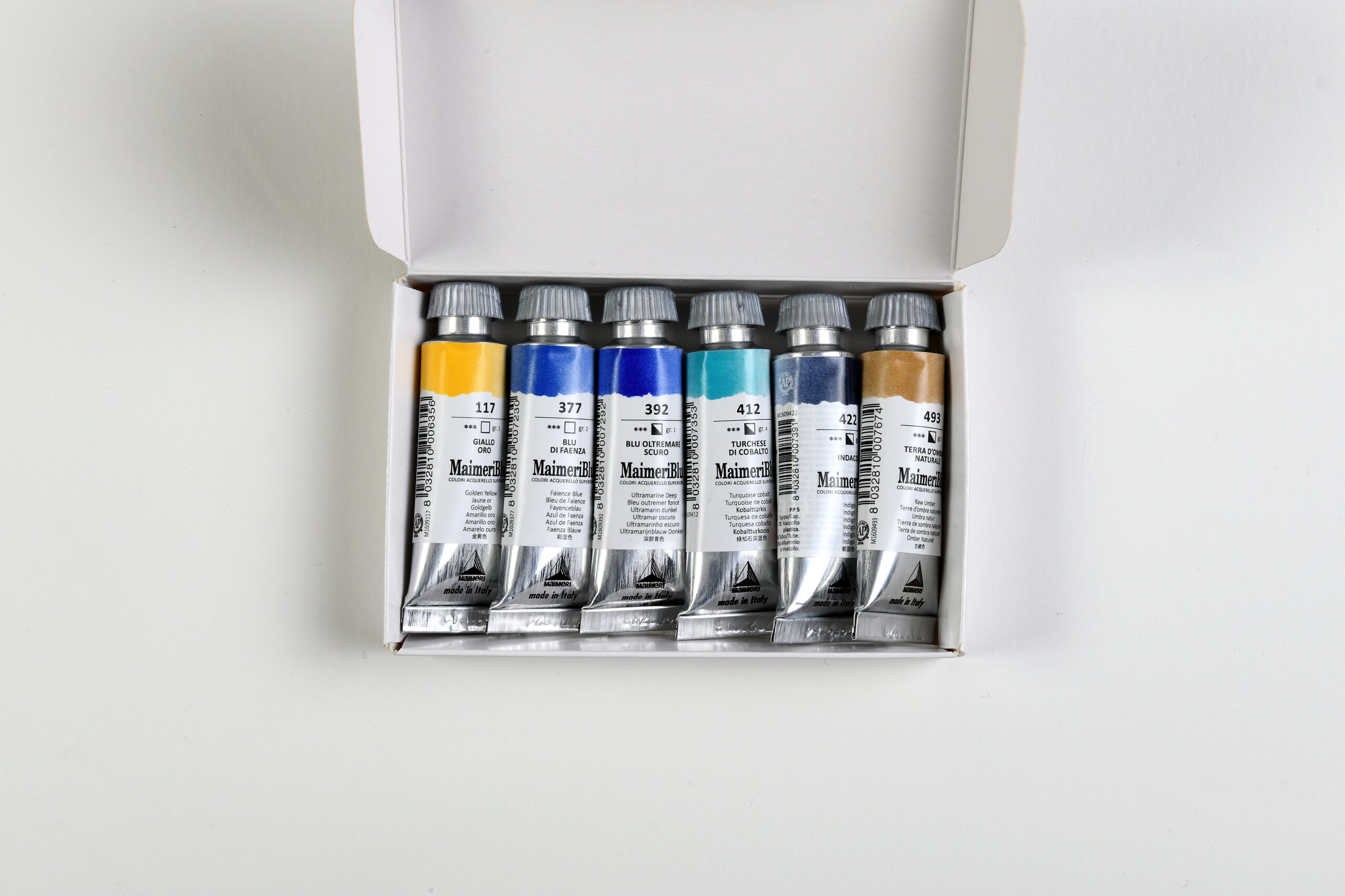 Maimeri Blu Fine Art Akvarellfarger – Arctic Set er et akvarellsett i profesjonell kunstnerkvalitet. Det er utviklet for deg som ønsker rene og transparente farger med høy kontroll. Settet inneholder 6 akvarellfarger i 12 ml tuber. Det passer både til detaljerte arbeider og større vasker.