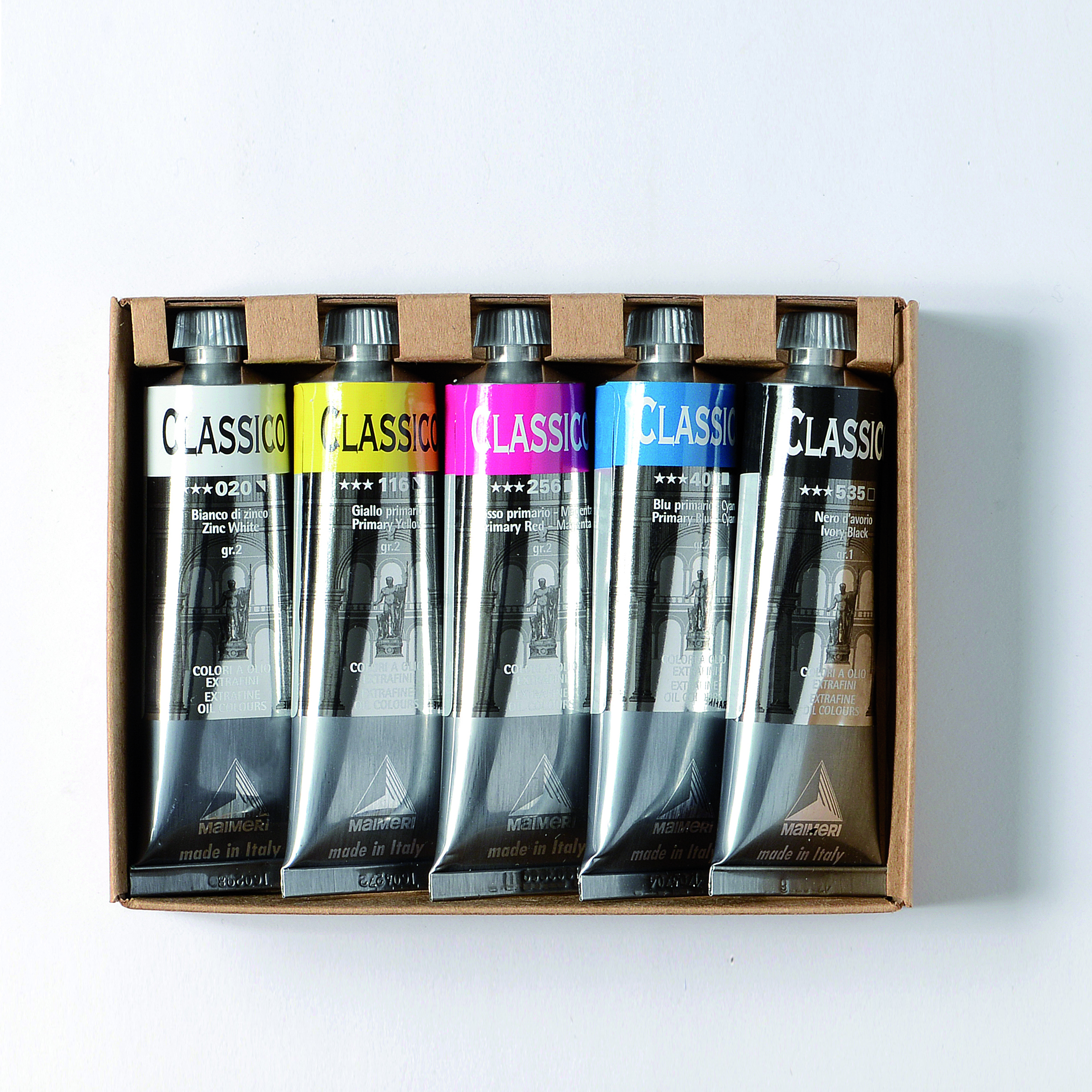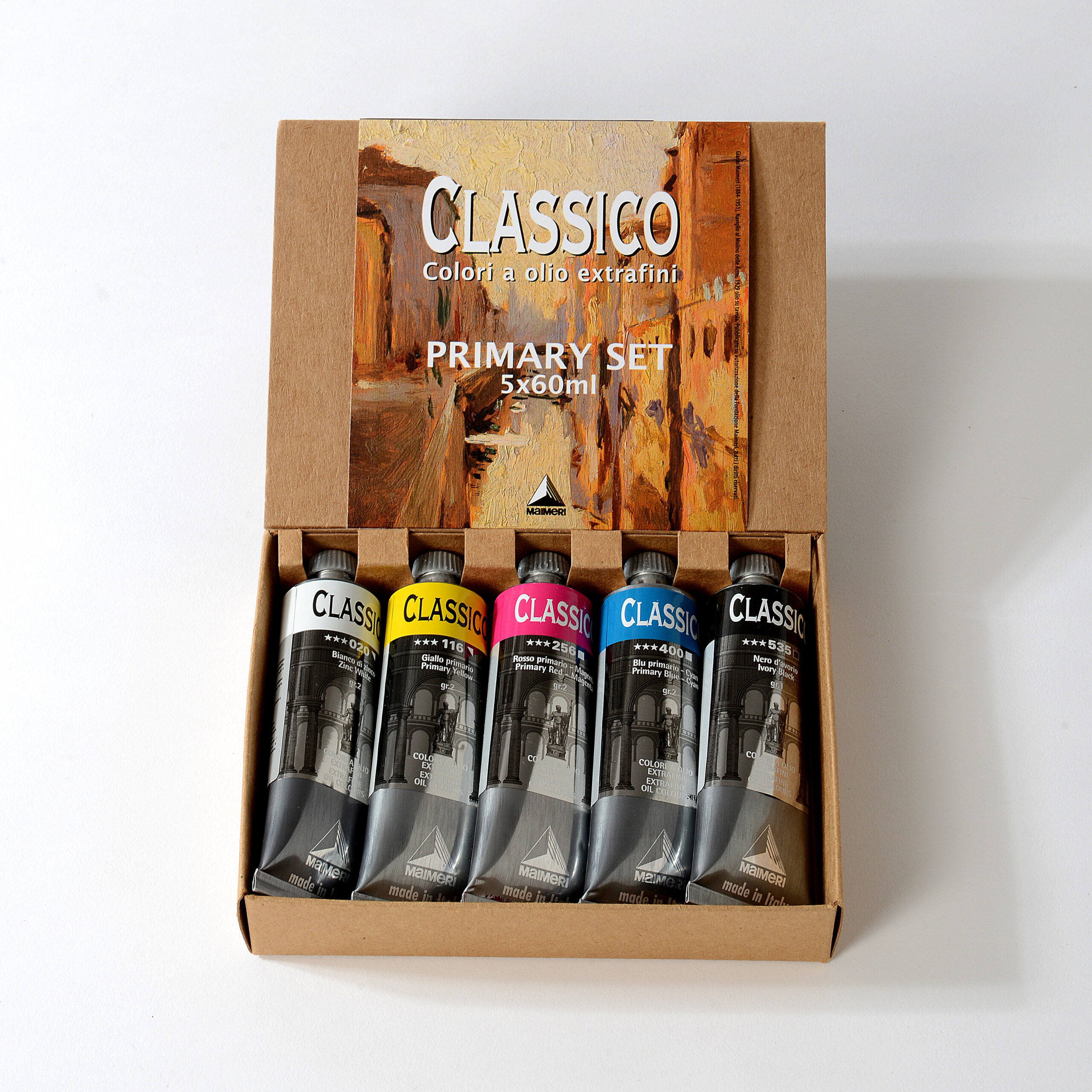 Maimeri Classico Primary Set 5×60 ml er et oljemalingssett med store tuber som gir deg en komplett grunnpalett for fargeblanding. Settet inneholder primærfargene gult, rødt og blått, supplert med hvitt og svart, og er ideelt for kunstnere som arbeider med større formater eller ønsker mer maling til daglig bruk i atelieret.