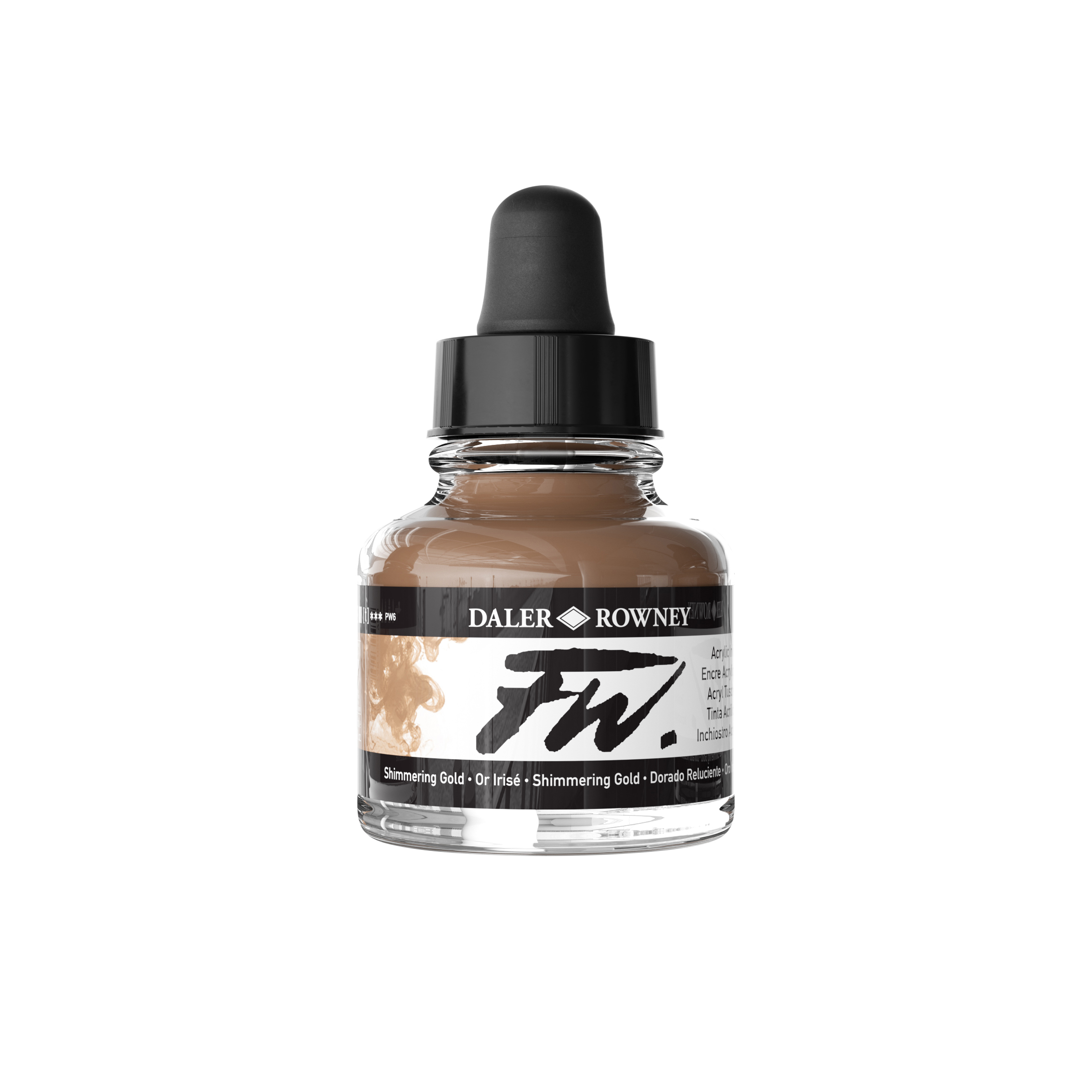 Daler‑Rowney FW Acrylic Ink i fargen Shimmering Gold er et pigmentbasert akrylblekk utviklet for kunstnere, illustratører og kreative hobbyprosjekter. Dette blekket gir en glitrende gulltone med metallic shimmer som reflekterer lys og tilfører ekstra dybde og glans i illustrasjoner, design og dekorative kunstprosjekter.