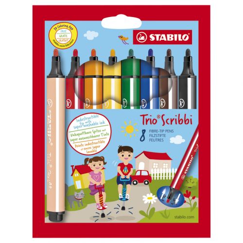 STABILO Trio Scribbi gir barna en trygg og kreativ tegneopplevelse. Dette settet inneholder 8 sterke og fargerike tusjpenner som passer små hender. Den trekantede ergonomiske formen gir et stabilt og sikkert grep, slik at barna kan tegne, male og krible i timevis uten ubehag i hånden.